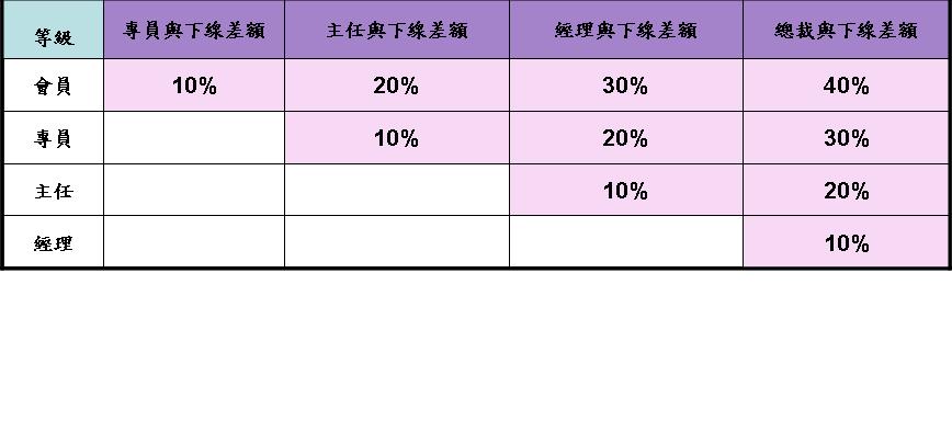三、組織獎金40% ●不同職級的直銷商因個人零售獎金不一,上下線間所產生的差額獎金部分謂之。